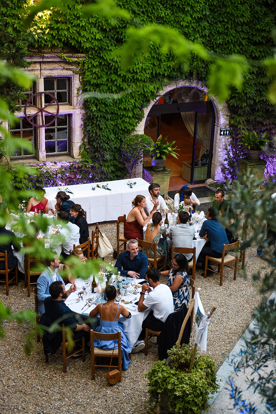 Se marier dans un château dans le Tarn : invités réunis pour le repas de mariage dans la cour du Château de Mauriac, lors d’un reportage de mariage naturel et coloré près d’Albi réalisé par Clémence Dubois, photographe de mariage Tarn et Albi